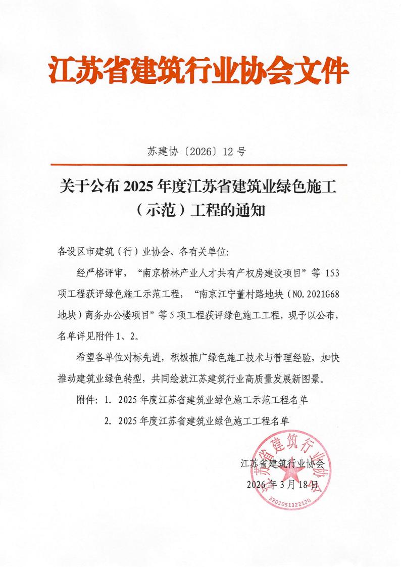 关于公布2025年度江苏省建筑业绿色施工(示范)工程的通知